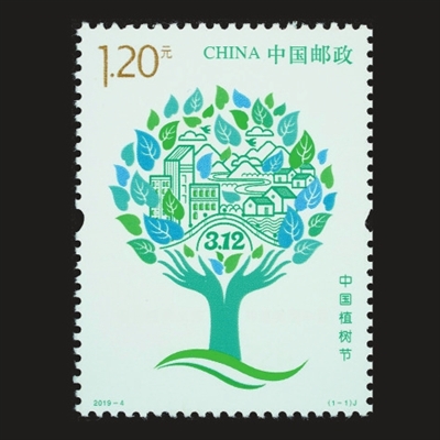 2019年是我国设立植树节40周年,邮政部门于3月12日发行《中国植树节》纪念邮票(上右图),画面上两只向上托起的手像树干,张开的五指像树枝,双手托起处有“3.12”字样。手指上方是生机盎然的绿叶,层层绿叶中点缀了城镇乡村、河流山川和飞鸟白云,寓意通过植树造林,共同建设青山绿水的美丽中国。