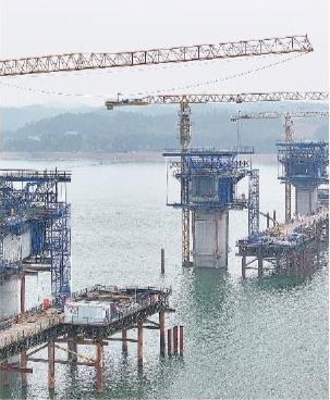 近日,峡江县重点民生项目仁和大桥渡改工程建设正酣。图为施工人员在挂篮作业。本报全媒体记者 吴文兵摄