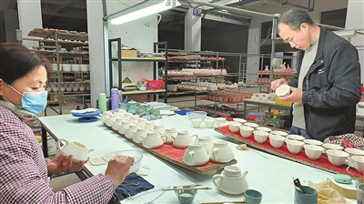 景德镇市柏采窑陶瓷有限公司生产车间内,员工在对上釉后的瓷坯进行检查。本报全媒体记者 王景萍摄