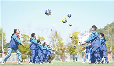 新学期开学以来,宜春市袁州区画眉小学开展多样化课间活动,帮助孩子们在体育锻炼和趣味游戏中增强体质。图为3月19日,该校学生正在练习排球。本报全媒体记者 张翰林摄