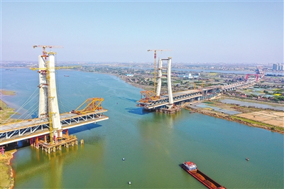 3月19日,南昌市隆兴大桥跨赣江西支主桥建设现场,施工人员正在进行钢梁施工安装。目前,钢梁架设已完成36节,完成率80%,预计今年5月底大桥实现钢梁合龙。
