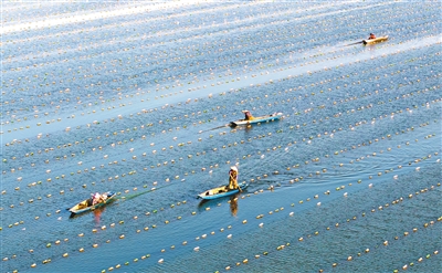 3月21日,在都昌县新妙湖珍珠养殖基地,蚌农正在投放珍珠蚌。特约通讯员 傅建斌摄