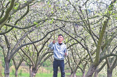 3月23日,在万载县潭埠镇昌集村,果农正在为蜂糖李树花人工授粉。特约通讯员 邓龙华摄