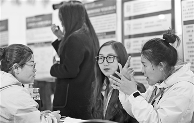 3月26日,招聘单位工作人员通过手语和参加招聘会的残障人士沟通。