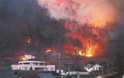 3月25日晚,山火蔓延至韩国庆尚北道安东的村庄。韩国山林厅26日说,22日起于庆尚北道义城郡的山火已蔓延至多地,从25日傍晚至26日晨已造成16人死亡。