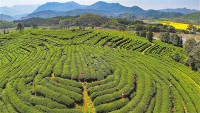 3月24日,在德兴市绕二镇重溪村茶山上,采茶工正在采摘春茶。通讯员 詹求昊摄
