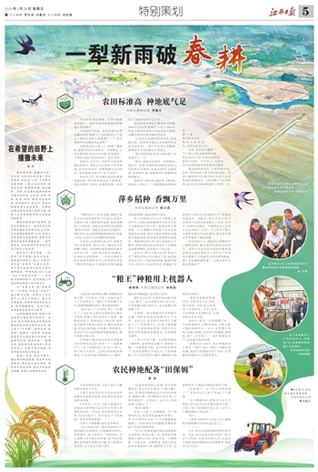 雨水润万物,春耕正当时。不久前,2025年江西省委一号文件发布,对全省“三农”工作进行全面部署,一幅以大地为纸、科技为笔的“春耕新蓝图”徐徐展开。今年,我省紧盯播种面积和产量目标任务,以良田、良种、良机、良法“四良”融合为重要举措,全力提单产、扩总产,坚决扛稳粮食安全政治责任。似锦的沃野田畴奏响动人的农忙曲,新农人正在希望的田野上书写春天的故事。