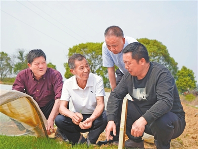▲万新才(左二)在田间指导农户解决早稻集中育秧遇到的难题。