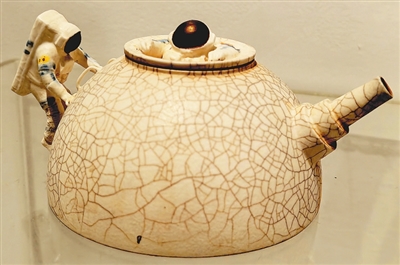 此外,王世航、王成昔的《距离·2024》,以理性揭示距离感的冰冷与恒定,钞子艺、钞子伟的《史迹》(右下图),对残破汉书的“仿制”之趣,李婳的《云泥系列》,以陶的烧制来对一张纸的质感和体积的巧妙“还原”,孟福伟的《太空计划·茶壶设计》(左中图),将宇航员攀爬造型化作壶手把设计的那种举重若轻,解丁泉的《皮肤》,以陶瓷组合构成带给我们对无穷真相的揭示,谭忠诚的《地纹》带给我们对于自然力量审美的敬畏与指引,刘祥的《私语》带给我们对困境与自在的自我观照,李洲洲的《人造自然1》带给我们对于美的一种个性诠释……这些作品都给人以新颖的审美体验,让我们得以清晰地看到实验陶瓷艺术带来的诸多可能性。正如策展人、省美协副主席孙晓晨提醒观众时所说的那样——“不要问陶瓷是什么,要问陶瓷能成为什么”。