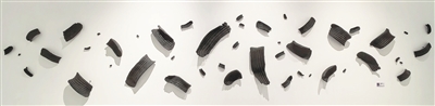 谢璇的《黑白造物》(右上图),在运用最新科技手段的同时,还散发着哲学思考带给艺术创作的那份欣喜与美感。挂在墙面的大小不一的“碎屑”,是来自雕塑刀刮削下来的、形状不规则的泥块。作者将此泥块用3D打印并适度放大后,进入窑炉烧制,最后呈现这种黑陶材质的“碎屑”阵列。这既是妙手偶得,又颇具匠心,远可接西方“现成品艺术”的方法论,近又自带东方的诗意、才情与哲思。