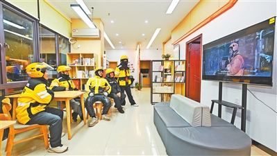 3月4日晚,南昌市红谷滩区九龙湖街道新琚东社区的新星驿站,不少外卖骑手在配送高峰期后,来到驿站休息区看电影,享受闲暇时光。