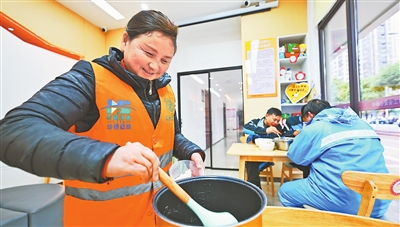 3月4日,户外劳动者在新星驿站里享用午餐。