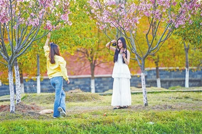 近日,新余市孔目江国家湿地公园樱花进入盛花期,市民漫步于樱花小径,赏美景、拍美照。本报全媒体记者 邹宇波摄