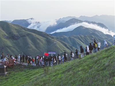 “五一”假期,萍乡武功山景区迎来客流高峰。图为5月1日,游客在金顶石碑区域饱览秀美风景。 本报全媒体记者 陈记昌摄