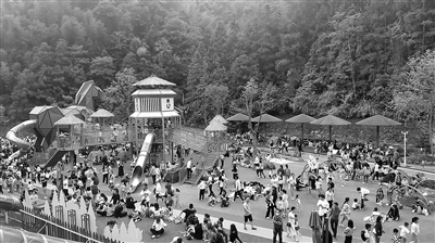 萍乡市湘东区白竺乡将林下休闲、亲子运动、山野马术、林间民宿与森林旅游业相结合,为游客提供丰富多彩的假日体验。图为5月1日,该乡一乐园内游人如织。 本报全媒体记者 刘启红摄