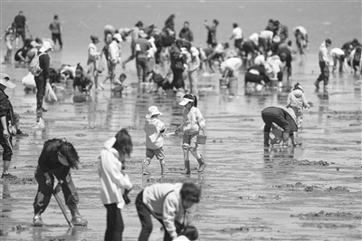 5月3日,游人在天津市滨海新区东疆亲海公园赶海。