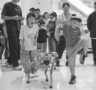 5月3日,在江苏省海安市一家商场内,孩子们与机器狗快乐互动。 新华社发 (徐劲柏摄)