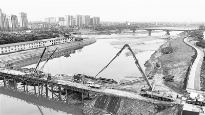 5月4日,永丰县恩江河长制主题公园,施工人员正在对河道进行生态综合治理。通讯员 刘浩军摄