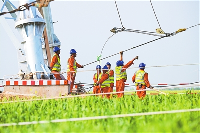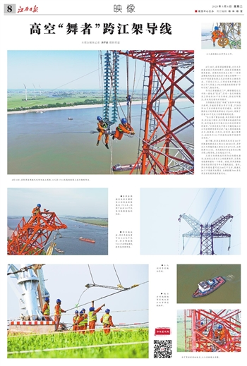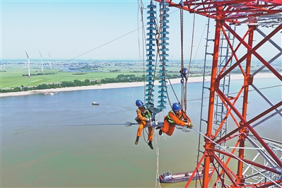 4月18日,在彭泽县棉船镇,大片大片的麦田在江风的吹拂下,荡起层层叠叠的绿色麦浪。其境内的省重点工程——彭泽县棉船风电项目迎来重大建设里程碑——110千伏配套线路正式启动跨长江放线作业。万里长江之上,江西送变电中建公司的工作人员登上172.8米高的铁塔精准“穿针引线”,架设导线。