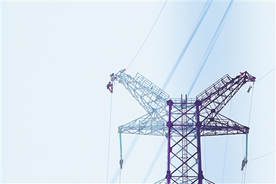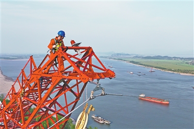 ◀彭泽县棉船风电项目横跨长江的两座铁塔高达172.8米,刷新了我省110千伏电力铁塔塔高的纪录。