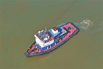 ▶施工方用拖船把导引绳从长江北岸牵引到南岸。