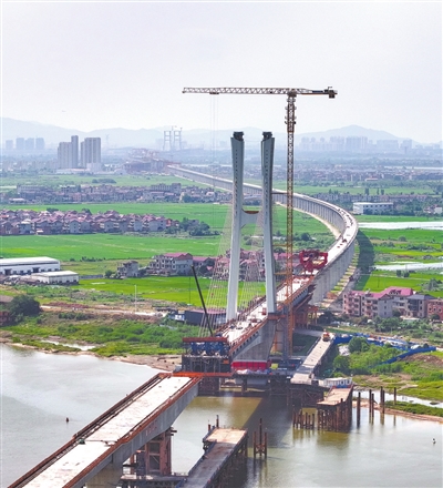 南昌隆兴大桥南支项目施工稳步推进。图为5月9日,施工人员正在进行预应力筋穿束作业。
