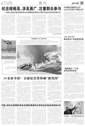 ●9月3日上午,以中共中央、全国人大常委会、国务院、全国政协、中央军委名义,在北京天安门广场隆重举行纪念中国人民抗日战争暨世界反法西斯战争胜利80周年大会,包括检阅部队。习近平将发表重要讲话。