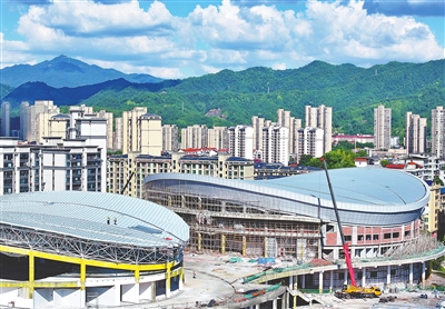 6月27日,石城县西城体育中心项目建设现场,工人正在安装体育馆钢结构屋面网架和顶棚。石城县西城体育中心项目包括体育馆、游泳馆、综合馆、体育场等,预计可容纳1万余人。特约通讯员 朱海鹏摄