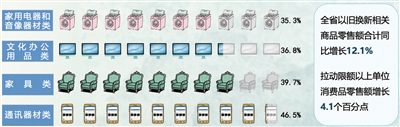 ——全省各地强化部门协同推进提振消费专项行动,加力扩围实施消费品以旧换新政策,持续激发消费潜能。上半年,限额以上单位通讯器材类、家具类、家用电器和音像器材类商品零售额同比分别增长46.5%、39.7%、35.3%。