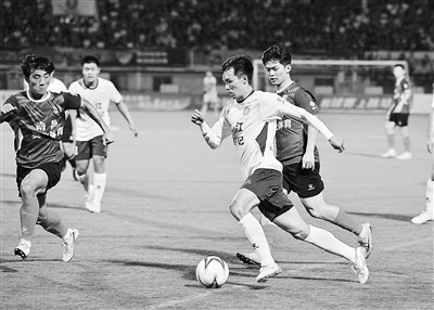 7月20日晚,南昌八一体育场,南昌队与九江队球员在比赛中拼抢。本报全媒体首席记者 杨继红摄