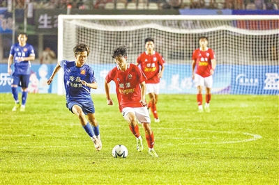 2025年江西省城市足球超级联赛(赣超)第三轮开打,鹰潭队在主场迎战来访的南昌队,最终南昌队3∶0取得联赛首胜。图为7月26日晚,在鹰潭市体育中心体育场,双方队员激烈拼抢。