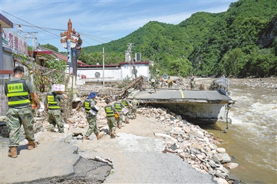 7月30日,在密云区冯家峪镇,救援人员为道路被阻断的村庄运送物资。