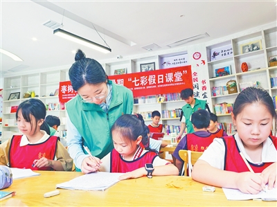 7月23日,在宜春市宜阳新区新时代文明实践中心,返乡大学生志愿者在微爱公益暑期“七彩假日课堂”辅导孩子的暑假作业。