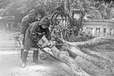 8月6日,工作人员在广东肇庆鼎湖区鼎湖山风景区门口用电锯切割被冲倒的树木。新华社记者 肖恩楠摄