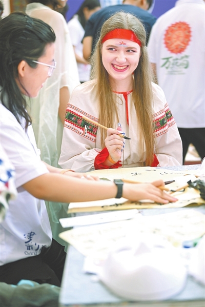 6日,上合国家青年学生在体验书法。