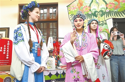 6日,上合国家青年学生在体验京剧艺术。