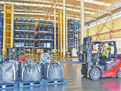 8月4日,位于宜春经开区的江西升华新材料有限公司智慧仓储车间,叉车正在装运作业。本报全媒体记者 邹海斌摄