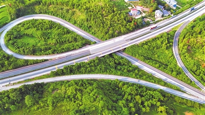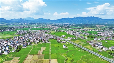 ◀近年来,会昌县持续加快交通路网建设,形成以铁路、高速、国道组成的“四纵四横”交通网络,助推乡村全面振兴。图为8月1日,该县小密乡杉背村,厦蓉高速、323国道穿境而过,区位优势明显。