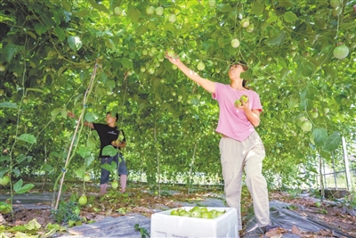 8月6日,宜春市袁州区西村镇紫藤种植专业合作社工作人员正忙着采摘百香果。据了解,该合作社种植百香果50亩,预计今年总产量超7万公斤,带动周边30余名村民实现就近就业。本报全媒体记者 朱兆恺摄