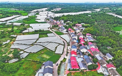 南昌市新建区金桥乡依托当地丰富的农业资源,发展葡萄种植产业,带动群众增收致富。该乡小桥村90%的村民从事葡萄种植,培育了夏黑、巨峰、阳光玫瑰等优质品种,今年葡萄产值可望突破1.4亿元。图为金桥乡小桥村连片大棚葡萄种植基地,与秀美村庄相互映衬。