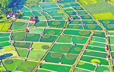 近年来,南丰县发展水产养殖业,实施乡村产业转型升级,助力乡村全面振兴。图为8月10日,南丰县太和镇丹阳村一带的甲鱼塘星罗棋布,犹如大地调色板。