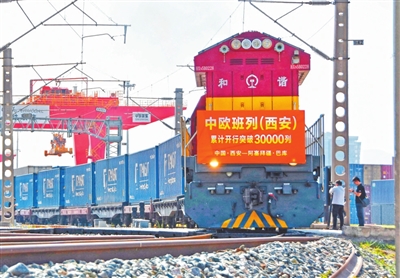 8月13日,X9043次中欧班列从西安国际港站驶出开往阿塞拜疆巴库。当日上午,满载着55个集装箱光伏组件的X9043次中欧班列从西安国际港站驶出,开往阿塞拜疆巴库,标志着中欧班列(西安)自2013年开行首列以来累计开行突破30000列,开行总量超过全国中欧班列累计开行总量的四分之一。新华社发(唐浦萌摄)