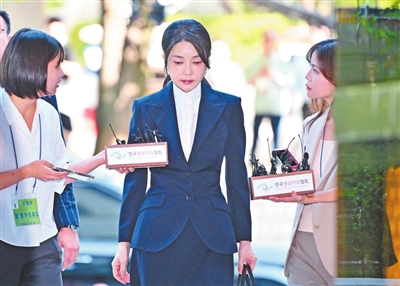 8月12日,在韩国首尔,韩国前总统尹锡悦妻子金建希(中)抵达法院。新华社/法新