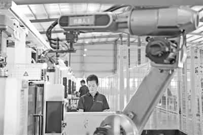 8月11日,位于庐山工业园区的先行能源有限公司生产车间内,工人在操作机器人生产双轴单晶硅太阳能智能跟踪支架。特约通讯员 韩俊烜摄