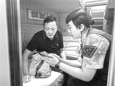 9月3日,北京丰台开往南昌的D137次列车上,列车工作人员向老年旅客介绍12306重点旅客服务功能,讲解如何便捷预约、享受专属服务,助力老年旅客顺畅出行。通讯员 郑 芳摄