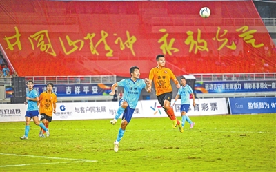 9月7日晚,赣超第九轮,在吉安市全民健身体育中心,主场作战的吉安队迎战抚州队,双方最终1∶1握手言和。图为比赛中,双方队员争抢头球。