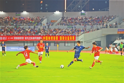 9月6日,赣超第九轮,九江队主场迎战鹰潭队,经过激烈比拼,九江队4∶0战胜鹰潭队。图为双方队员积极争抢球权。本报全媒体记者 吴福清摄