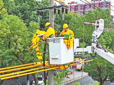 9月16日,赣江新区新祺周管理处,国网江西省电力有限公司南昌市昌北供电分公司带电作业班工作人员在国药北大道10千伏线路上进行带电作业,保障电网线路安全平稳运行。通讯员 袁 骏摄