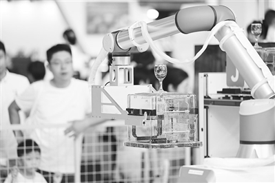 ▲9月21日,在2025世界制造业大会智能机器人展区,一款工业机器人为观众演示拿放杯子。