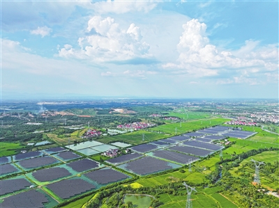 近年来,上高县充分利用鱼塘、荒坡等建设“渔光互补”“农光互补”光伏电站,实现经济、生态效益双丰收。图为近日,该县芦洲乡光伏电站与田野、村庄,构成一幅生态画卷。本报全媒体记者 吴文兵摄
